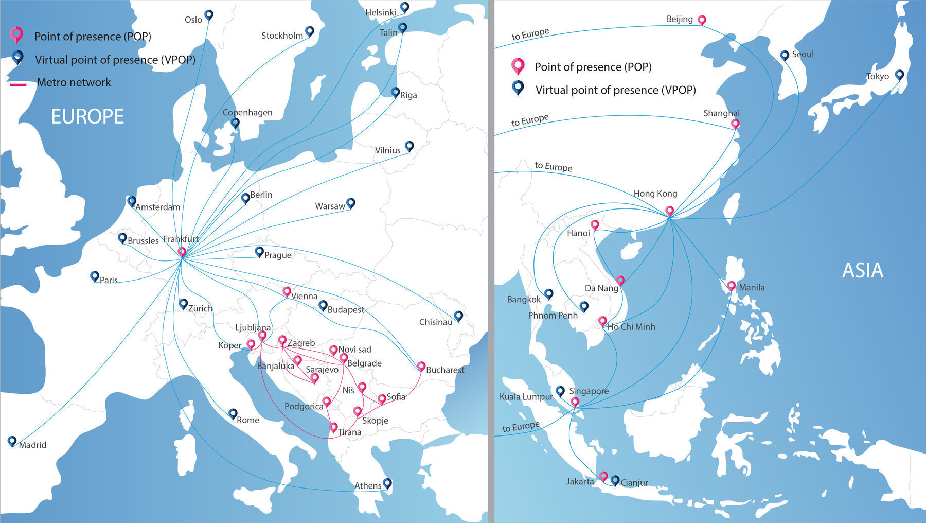 Imamo pristupne tačke u Njemačkoj, Austriji, Sloveniji, Hrvatskoj, Srbiji, Bosni i Hercegovini, Bugarskoj, Rumunjskoj, Makedoniji, Crnoj Gori, Albaniji, Kini, Vijetnamu, Singapuru, Indoneziji i na Filipinih (u većini ovih zemalja imamo svoja predstavništva). Povezivanje diljem svijeta osigurali smo direktnim vezama na backbone mrežu ( Tier -1). Primarna povezanost je na Sprint mrežu.
